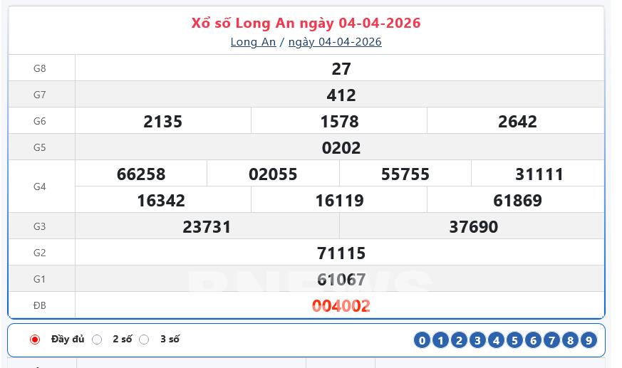 Kết quả xổ số Long An ngày 4/4/2026