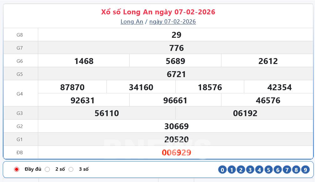 Kết quả xổ số Long An ngày 7/2/2026