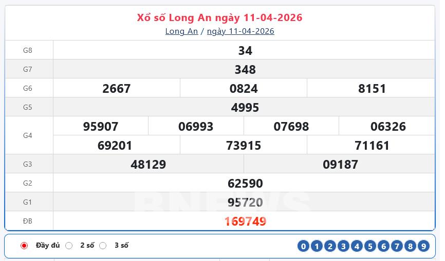 Kết quả xổ số Long An ngày 11/4/2026