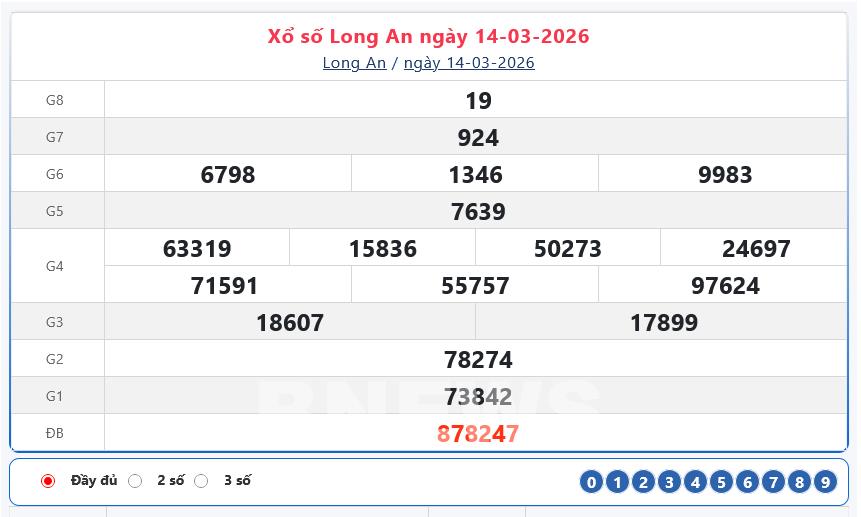 Bnews. XSLA 7/3. Kết quả xổ số hôm nay ngày 7/3. XSLA Thứ Bảy. Trực tiếp KQXSLA ngày 7/3. Kết quả xổ số Long An hôm nay ngày 7/3/2026.