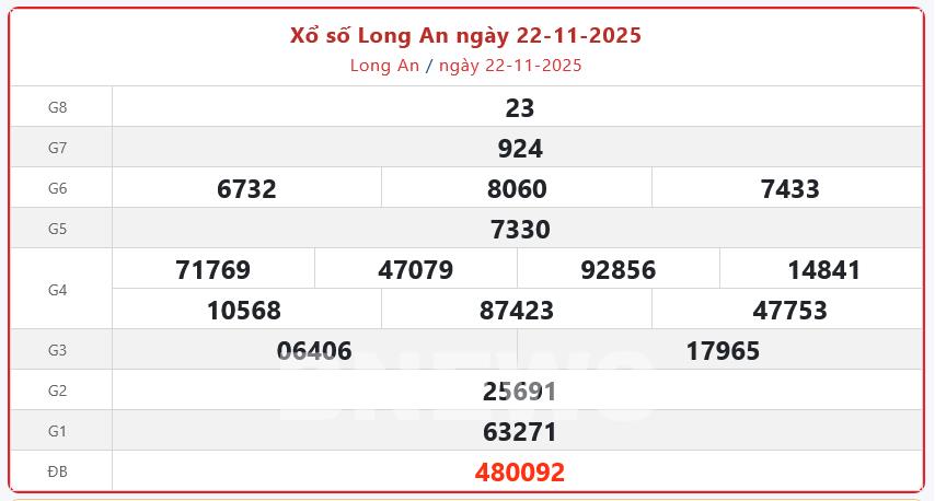 Bnews. XSLA 22/11. Kết quả xổ số hôm nay ngày 22/11. XSLA Thứ Bảy. Trực tiếp KQXSLA ngày 22/11. Kết quả xổ số Long An hôm nay ngày 22/11/2025.