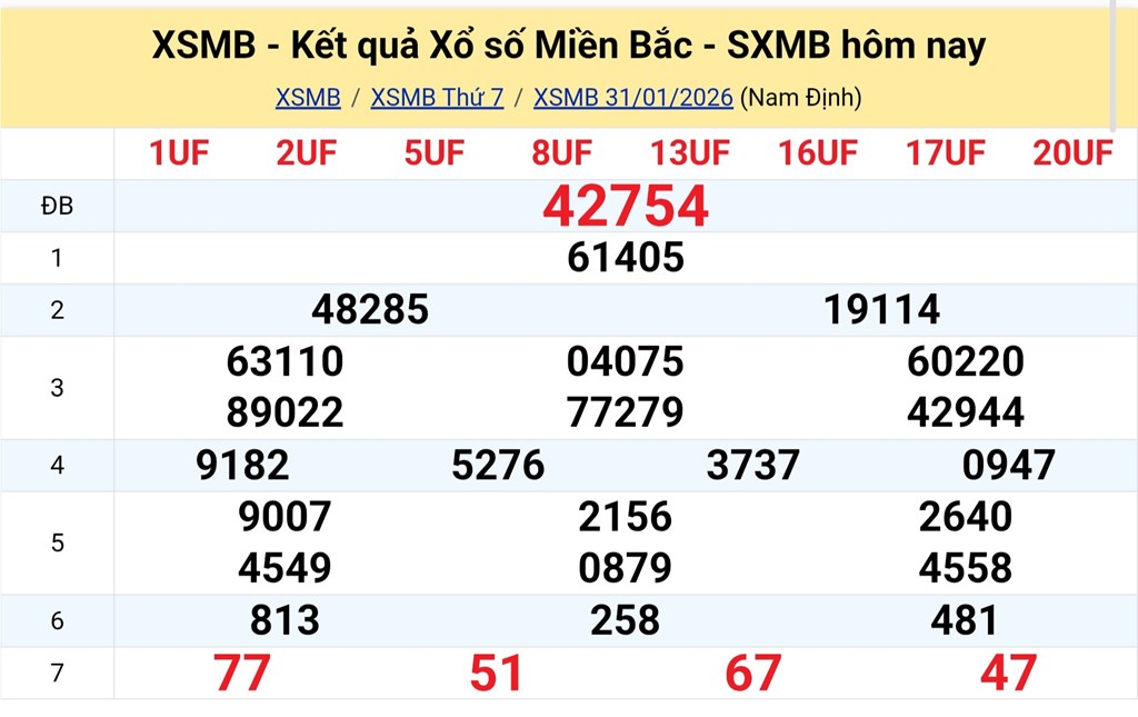 Kết quả xổ số miền Bắc ngày 31/1. KQXSMB 31/1/2026. XSMB 31/1.