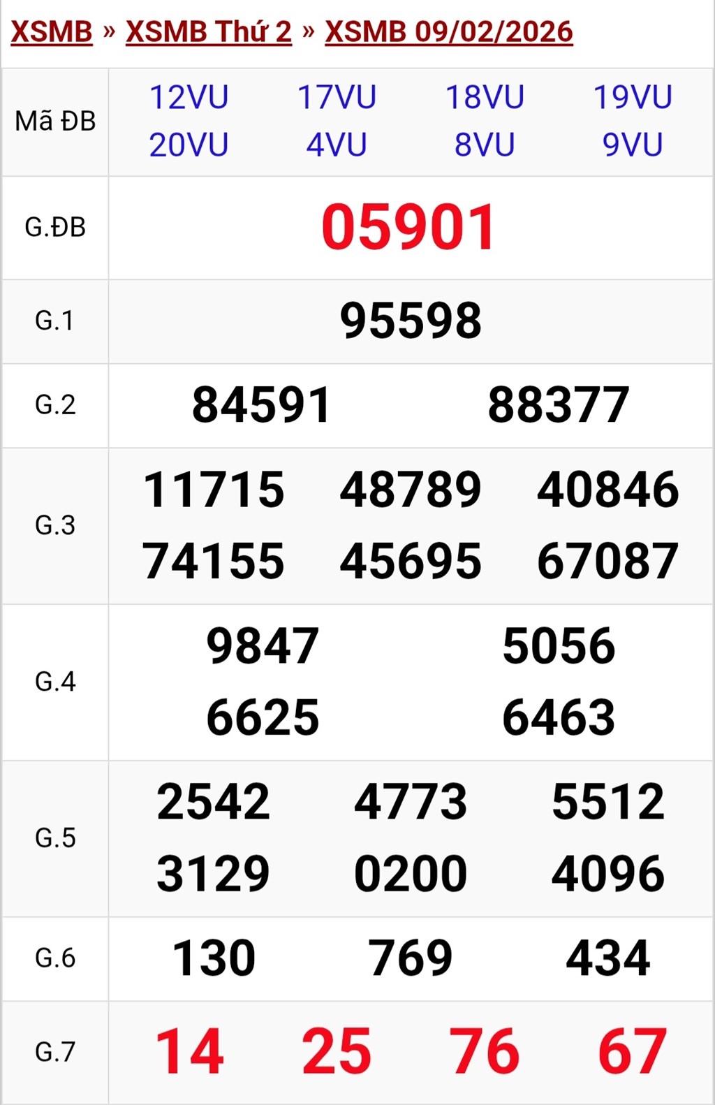 Kết quả xổ số miền Bắc ngày 9/2. KQXSMB 9/2/2026. XSMB 9/2.