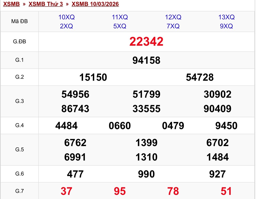 Kết quả xổ số miền Bắc ngày 10/3. KQXSMB 10/3/2026. XSMB 10/3.