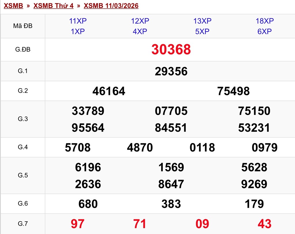Kết quả xổ số miền Bắc ngày 11/3. KQXSMB 11/3/2026. XSMB 11/3.