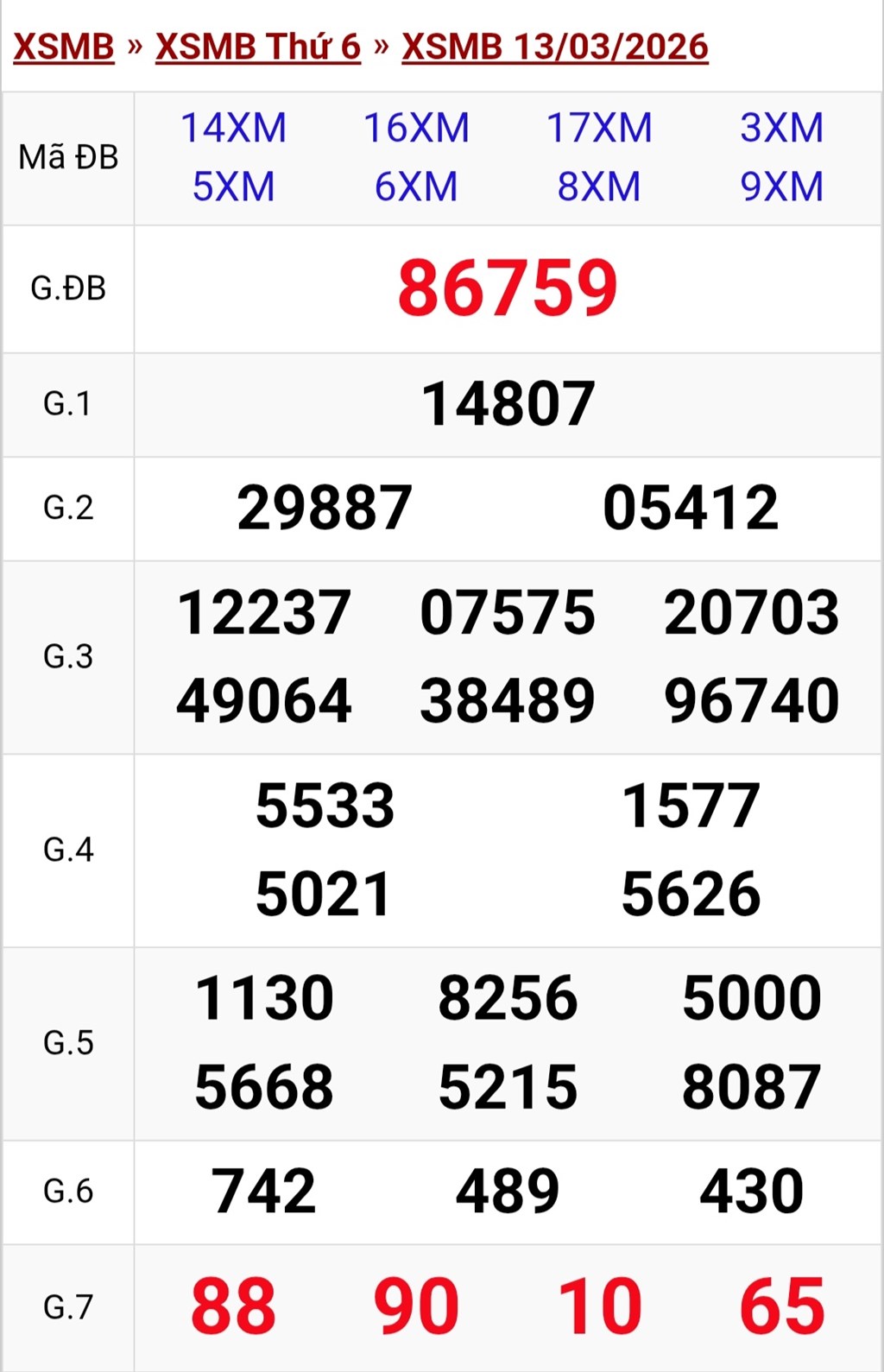 Kết quả xổ số miền Bắc ngày 13/3. KQXSMB 13/3/2026. XSMB 13/3.