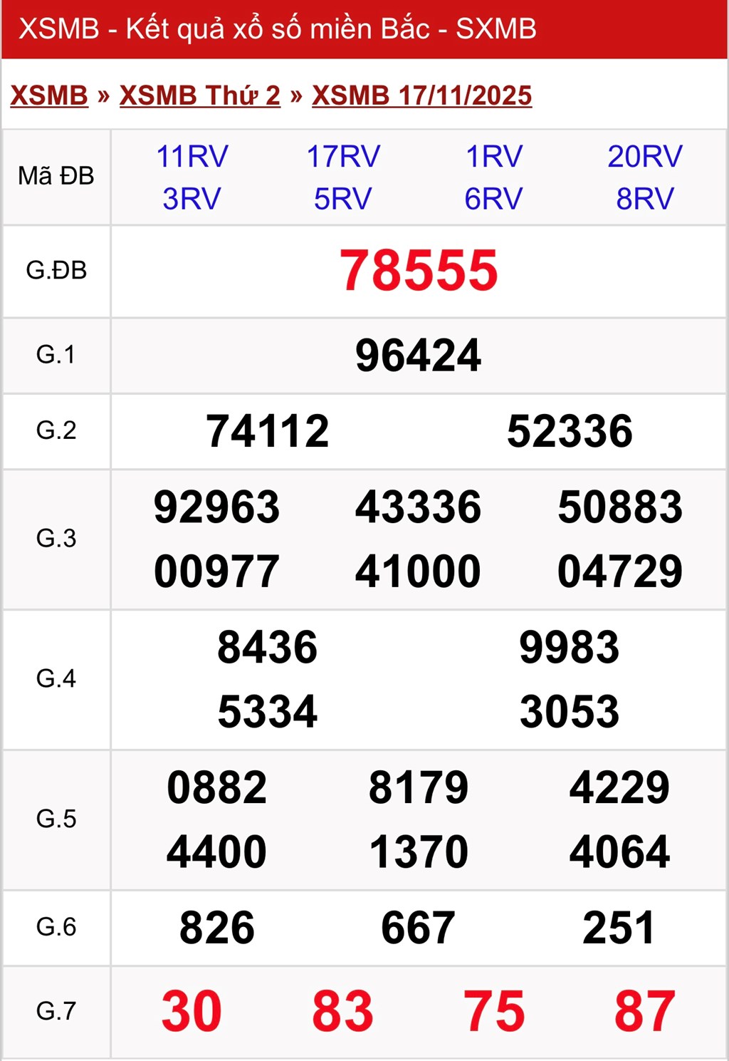 Kết quả xổ số miền Bắc ngày 17/11. KQXSMB 17/11/2025. XSMB 17/11.