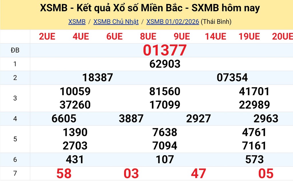XSMB 1/2. Kết quả xổ số miền Bắc hôm nay ngày 1/2/2026. XSMB chủ Nhật ngày 1/2