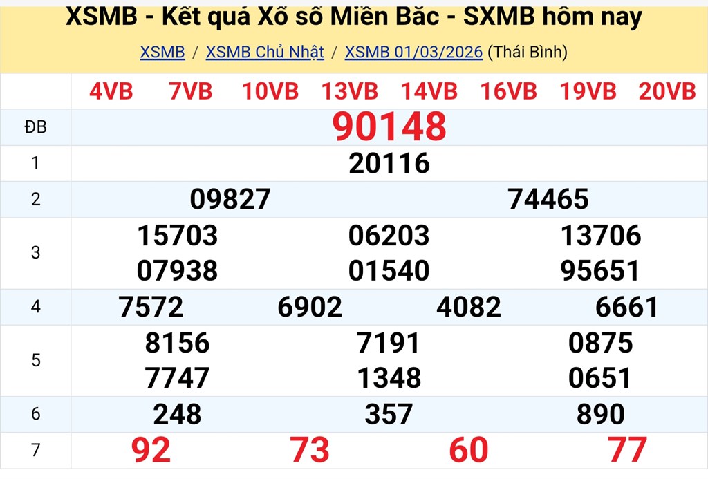 Bnews. XSMB 1/3. Kết quả xổ số hôm nay ngày 1/3. XSMB chủ Nhật. Trực tiếp KQXSMB ngày 1/3. Kết quả xổ số miền Bắc hôm nay chủ Nhật ngày 1/3/2026.