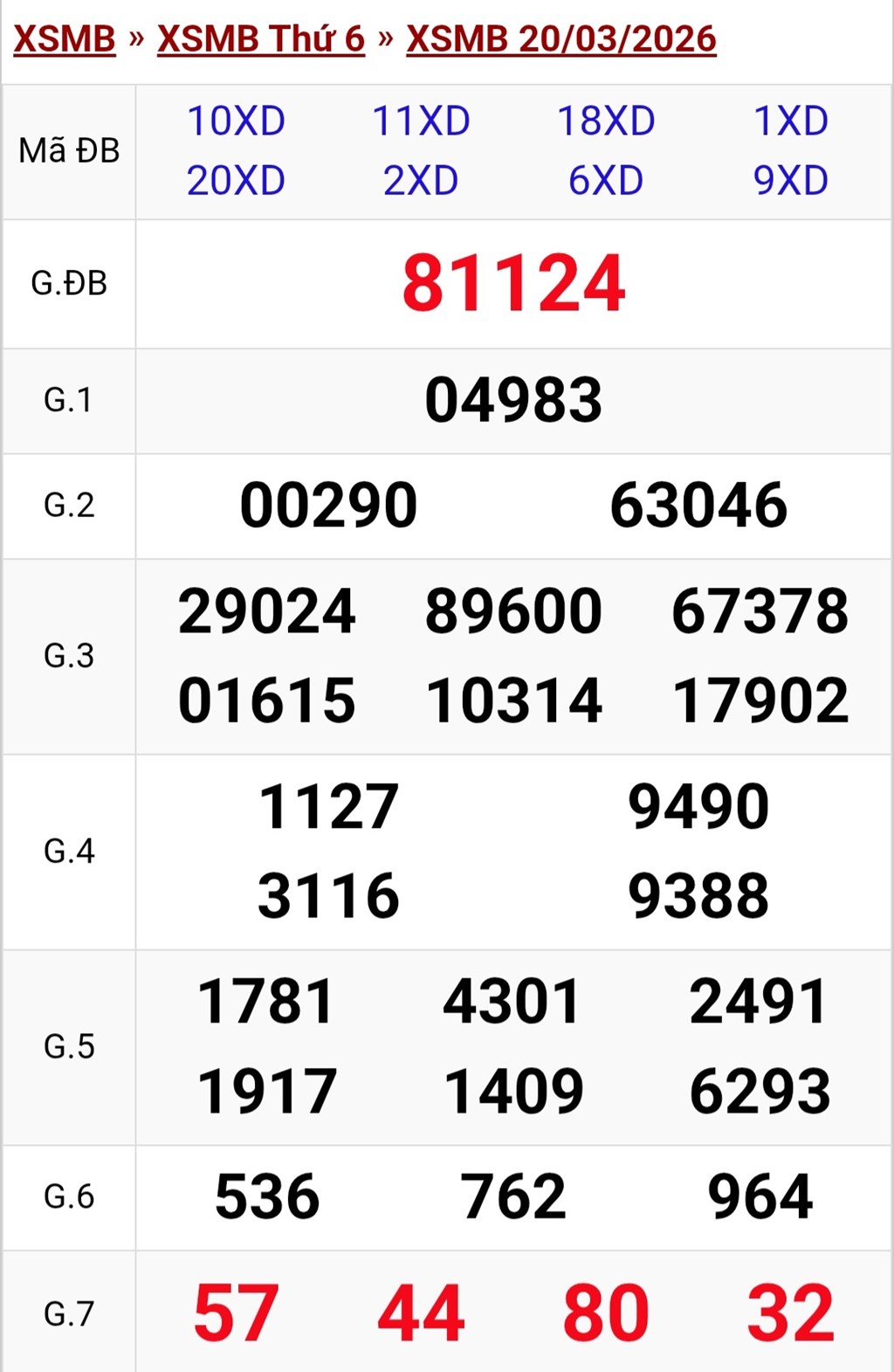 Kết quả xổ số miền Bắc ngày 20/3. KQXSMB 20/3/2026. XSMB 20/3.