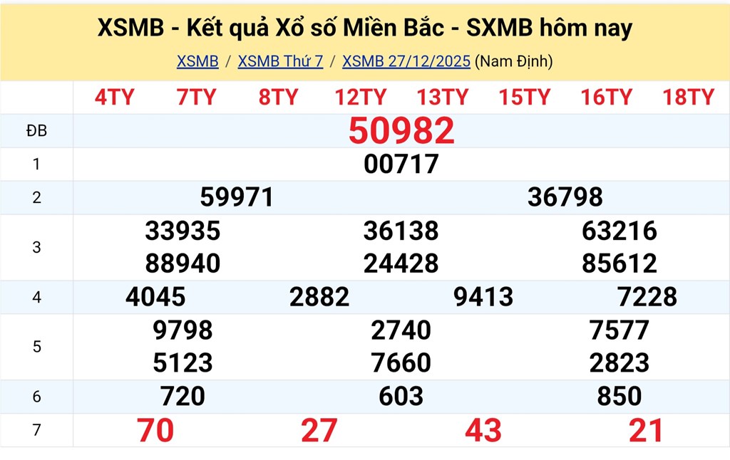 XSMB 27/12. Kết quả xổ số miền Bắc hôm nay ngày 27/12/2025. XSMB thứ Bảy ngày 27/12