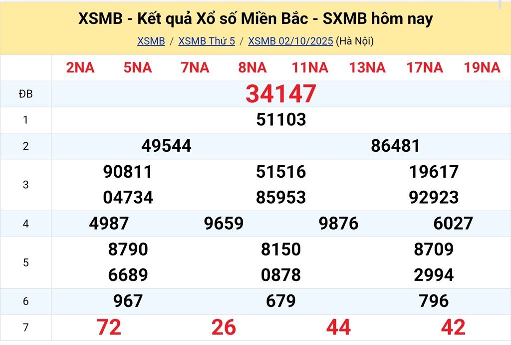 Kết quả xổ số miền Bắc ngày 2/10. KQXSMB 2/10/2025. XSMB 2/10.