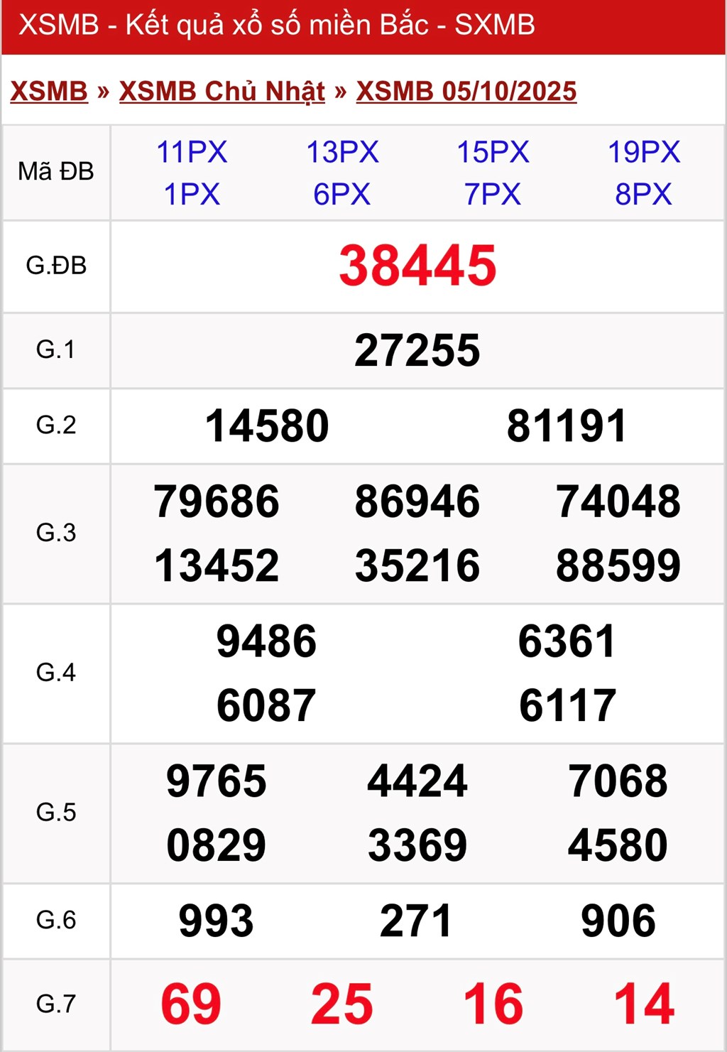 Kết quả xổ số miền Bắc ngày 5/10. KQXSMB 5/10/2025. XSMB 5/10.