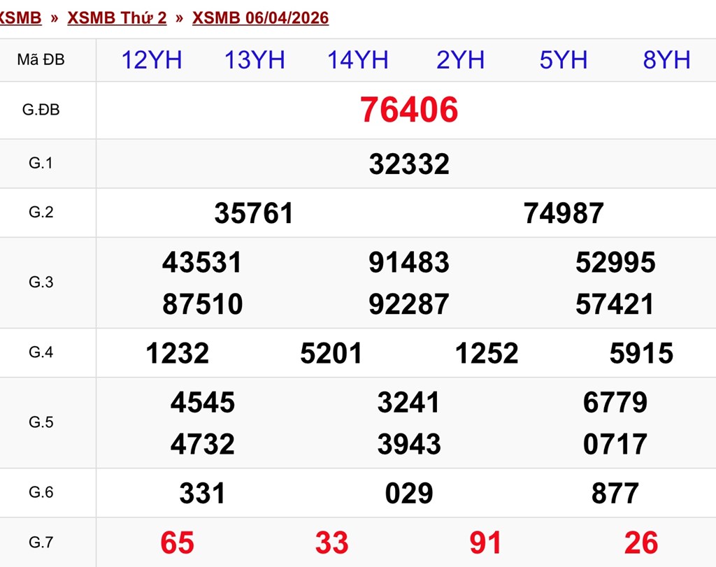 Kết quả xổ số miền Bắc ngày 6/4. KQXSMB 6/4/2026. XSMB 6/4.
