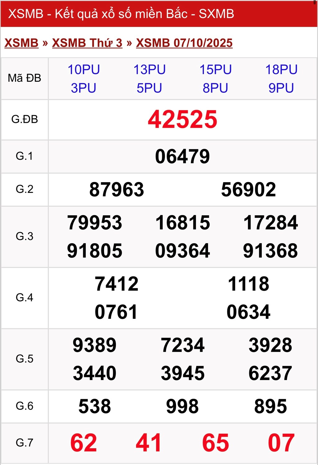 XSMB 7/10. Kết quả xổ số miền Bắc hôm nay ngày 7/10/2025. XSMB thứ Ba ngày 7/10