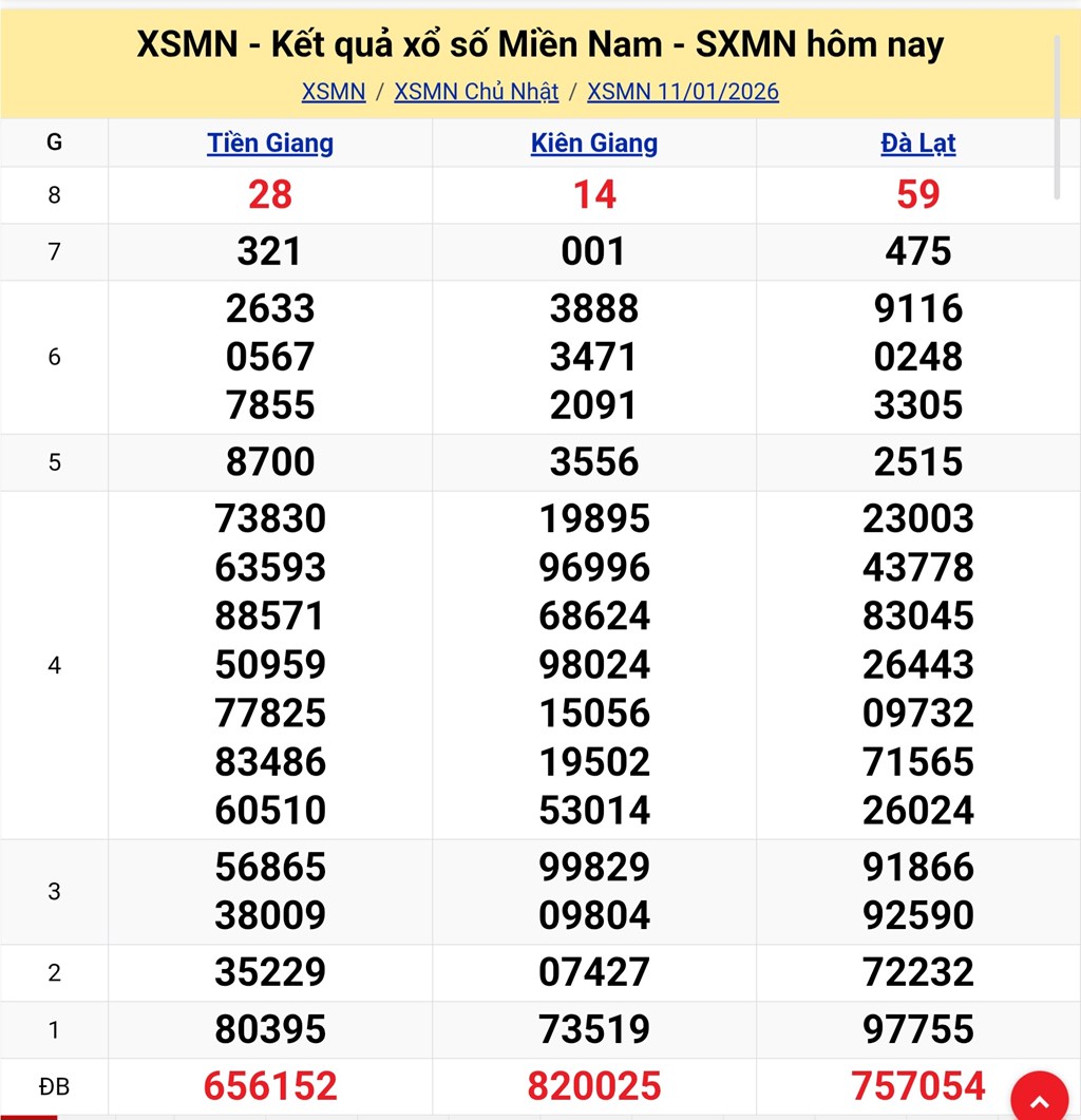 XSMN 11/1. KQXSMN 11/1/2026. Kết quả xổ số hôm nay ngày 11/1. XSMN chủ Nhật. Xổ số miền Nam hôm nay 11/1/2026. Trực tiếp KQXSMN ngày 11/1. Kết quả xổ số miền Nam hôm nay chủ Nhật ngày 11/1/2026.