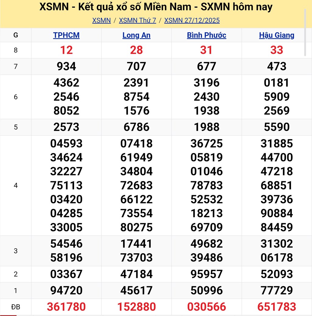 XSMN 27/12. Kết quả xổ số miền Nam hôm nay ngày 27/12/2025. XSMN thứ Bảy ngày 27/12