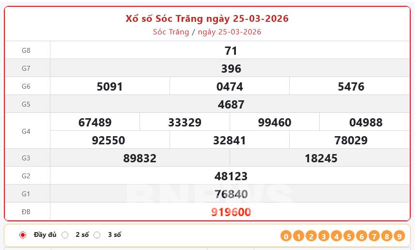Bnews. XSST 25/3. Kết quả xổ số hôm nay ngày 25/3. XSST Thứ Tư. Trực tiếp KQXSST ngày 25/3. Kết quả xổ số Sóc Trăng hôm nay ngày 25/3/2026. Kết quả xổ số Sóc Trăng Thứ Tư ngày 25/3/2026.