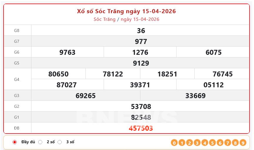 Kết quả xổ số Sóc Trăng Thứ Tư ngày 15/4/2026