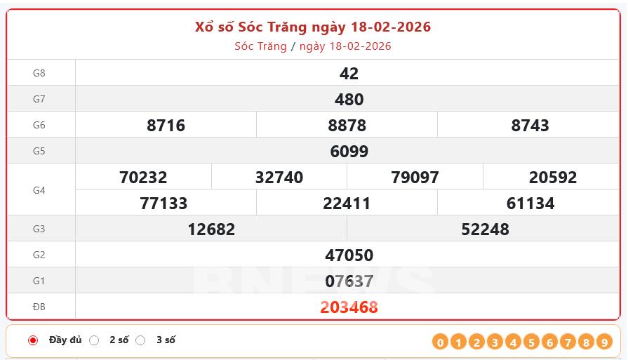 Kết quả xổ số Sóc Trăng Thứ Tư ngày 18/2/2026