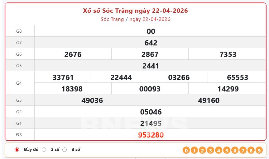 Kết quả xổ số Sóc Trăng Thứ Tư ngày 22/4/2026
