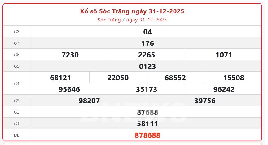 Kết quả xổ số Sóc Trăng Thứ Tư ngày 31/12/2025
