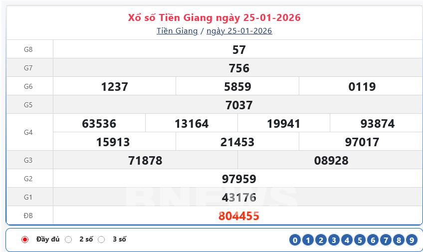 Bnews. XSTG 25/1. Kết quả xổ số hôm nay ngày 25/1. XSTG Chủ nhật. Trực tiếp KQXSTG ngày 25/1. Kết quả xổ số Tiền Giang hôm nay ngày 25/1/2026.