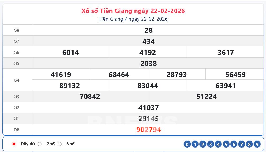 Bnews. XSTG 22/2. Kết quả xổ số hôm nay ngày 22/2. XSTG Chủ nhật. Trực tiếp KQXSTG ngày 22/2. Kết quả xổ số Tiền Giang hôm nay ngày 22/2/2026.