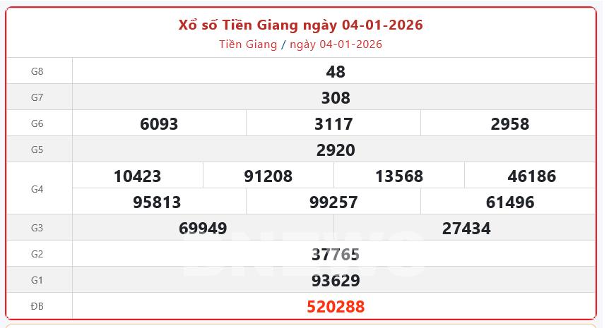 Bnews. XSTG 4/1. Kết quả xổ số hôm nay ngày 4/1. XSTG Chủ nhật. Trực tiếp KQXSTG ngày 4/1. Kết quả xổ số Tiền Giang hôm nay ngày 4/1/2026.