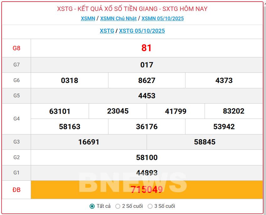 Bnews. XSTG 5/10. Kết quả xổ số hôm nay ngày 5/10. XSTG Chủ nhật. Trực tiếp KQXSTG ngày 5/10. Kết quả xổ số Tiền Giang hôm nay ngày 5/10/2025.