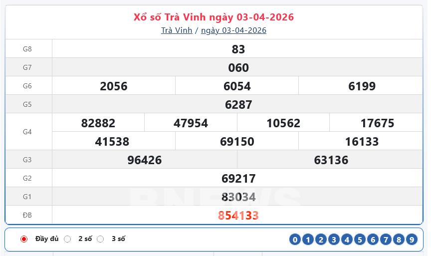 Kết quả xổ số Trà Vinh ngày 3/4/2026