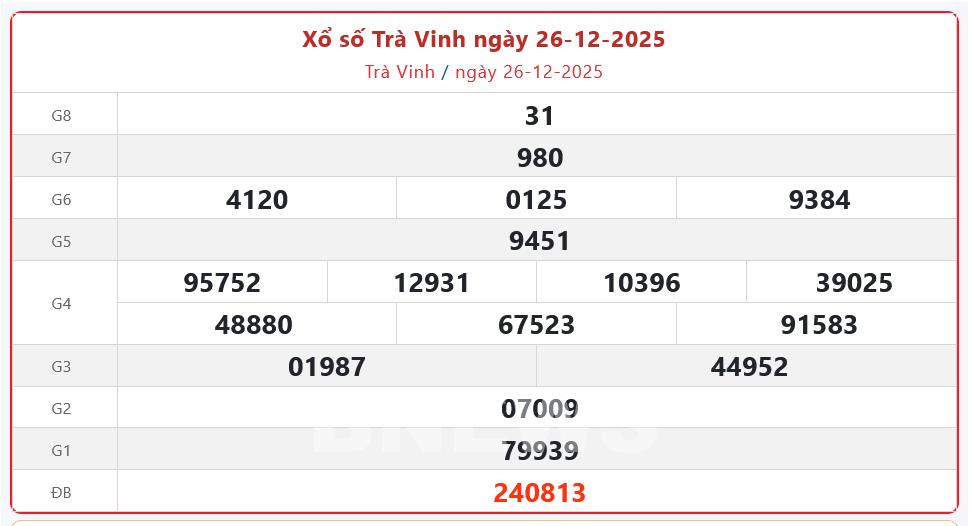 Kết quả xổ số Trà Vinh ngày 26/12/2025