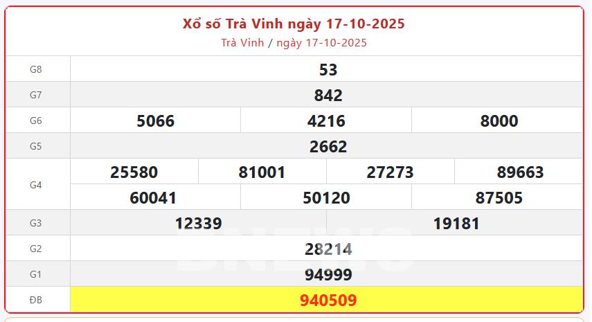 Kết quả xổ số Trà Vinh ngày 17/10/2025