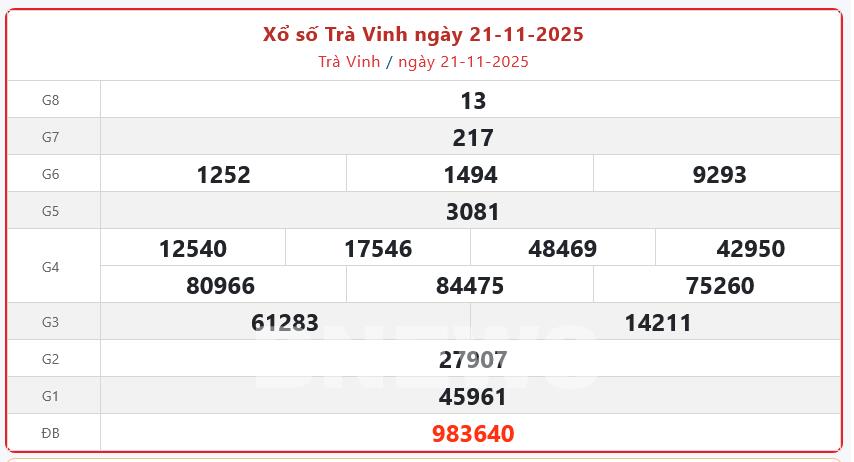 Kết quả xổ số Trà Vinh ngày 21/11/2025