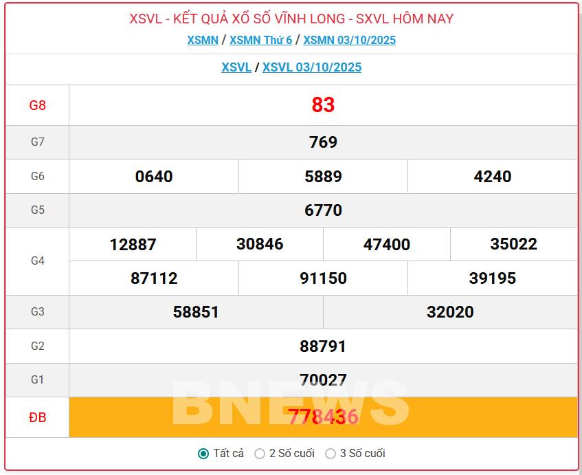 Bnews. XSVL 3/10. Kết quả xổ số hôm nay ngày 3/10. XSVL thứ Sáu. Trực tiếp KQXSVL ngày 3/10. Kết quả xổ số Vĩnh Long hôm nay ngày 3/10/2025.