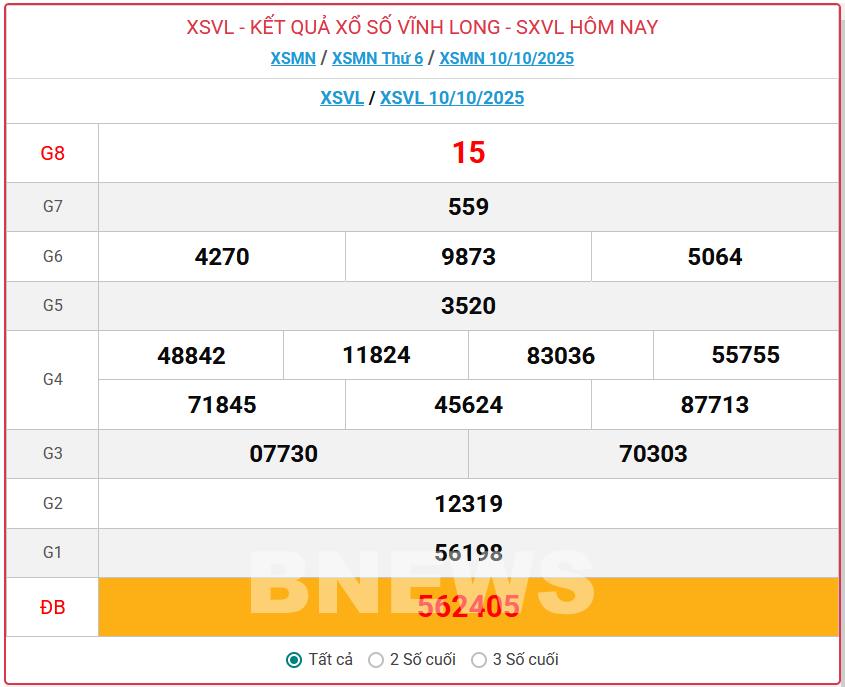 Bnews. XSVL 10/10. Kết quả xổ số hôm nay ngày 10/10. XSVL thứ Sáu. Trực tiếp KQXSVL ngày 10/10. Kết quả xổ số Vĩnh Long hôm nay ngày 10/10/2025.