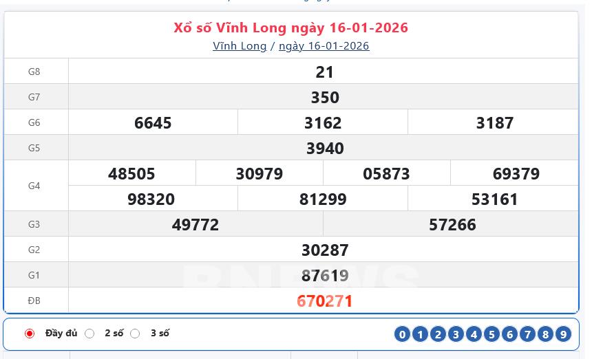 Bnews. XSVL 16/1. Kết quả xổ số hôm nay ngày 16/1. XSVL thứ Sáu. Trực tiếp KQXSVL ngày 16/1. Kết quả xổ số Vĩnh Long hôm nay ngày 16/1/2026.