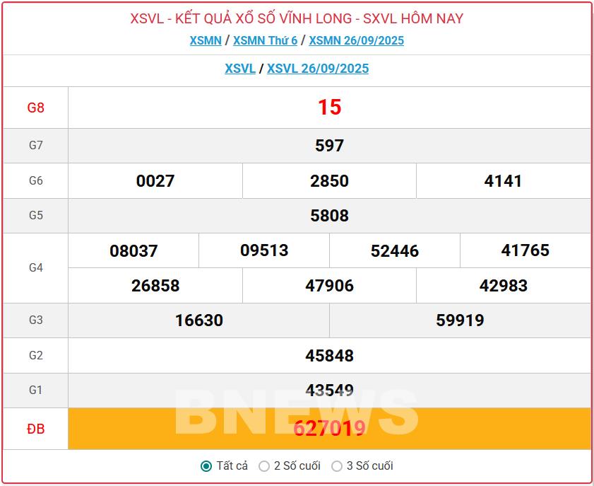 Bnews. XSVL 26/9. Kết quả xổ số hôm nay ngày 26/9. XSVL thứ Sáu. Trực tiếp KQXSVL ngày 26/9. Kết quả xổ số Vĩnh Long hôm nay ngày 26/9/2025.