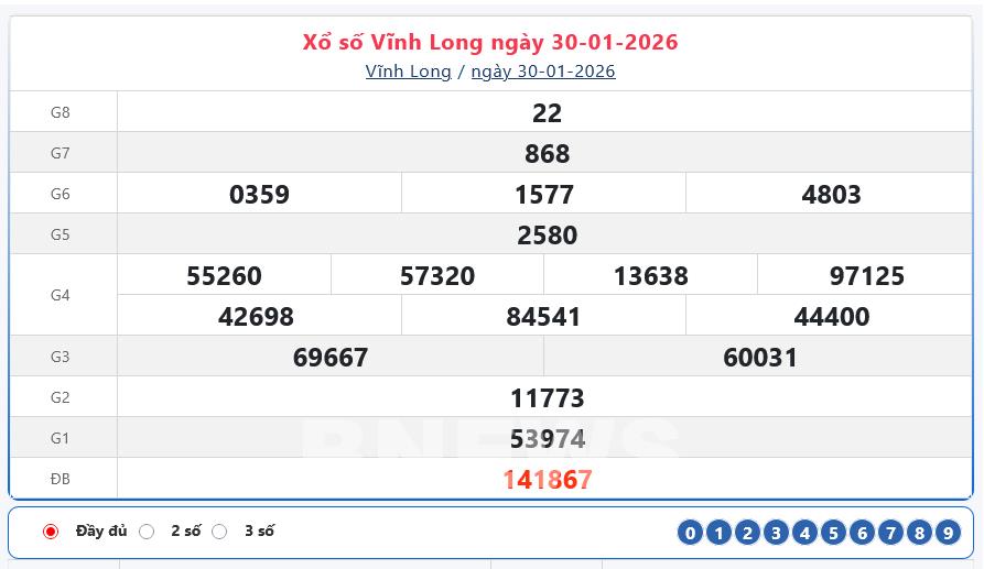 Kết quả xổ số Vĩnh Long ngày 30/1/2026