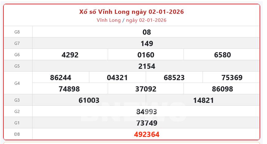 Bnews. XSVL 2/1. Kết quả xổ số hôm nay ngày 2/1. XSVL thứ Sáu. Trực tiếp KQXSVL ngày 2/1. Kết quả xổ số Vĩnh Long hôm nay ngày 2/1/2026.
