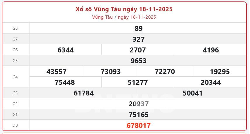 Kết quả xổ số Vũng Tàu Thứ Ba ngày 18/11/2025