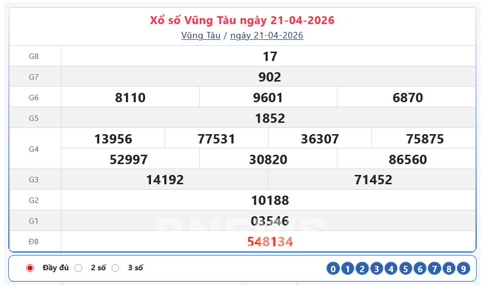 Kết quả xổ số Vũng Tàu Thứ Ba ngày 21/4/2026