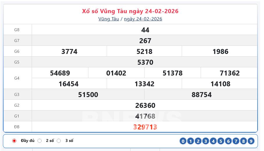 Kết quả xổ số Vũng Tàu Thứ Ba ngày 24/2/2026