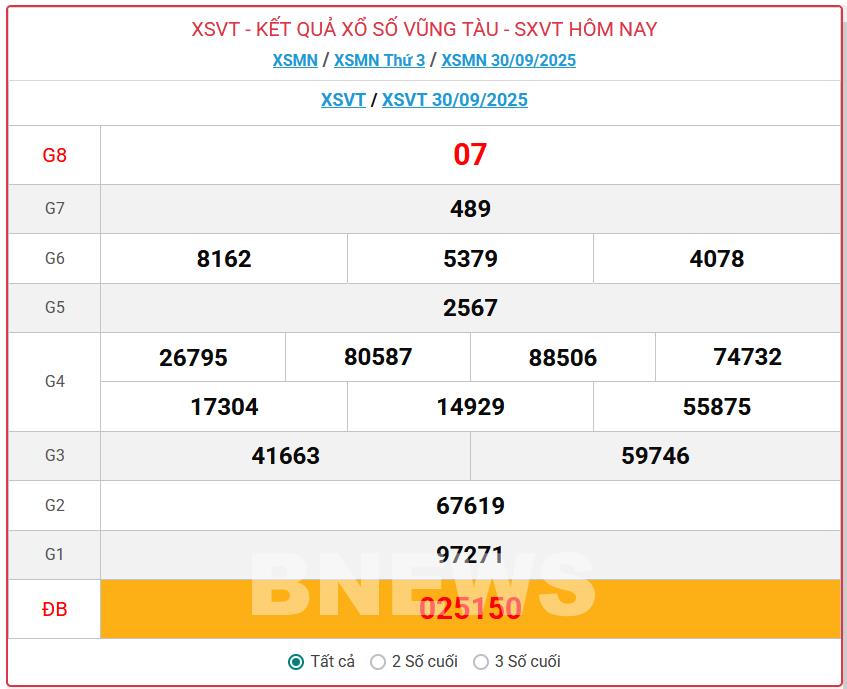 Bnews. XSVT 30/9. Kết quả xổ số hôm nay ngày 30/9. XSVT Thứ Ba. Trực tiếp KQXSVT ngày 30/9. Kết quả xổ số Vũng Tàu hôm nay ngày 30/9/2025. Kết quả xổ số Vũng Tàu Thứ Ba ngày 30/9/2025.