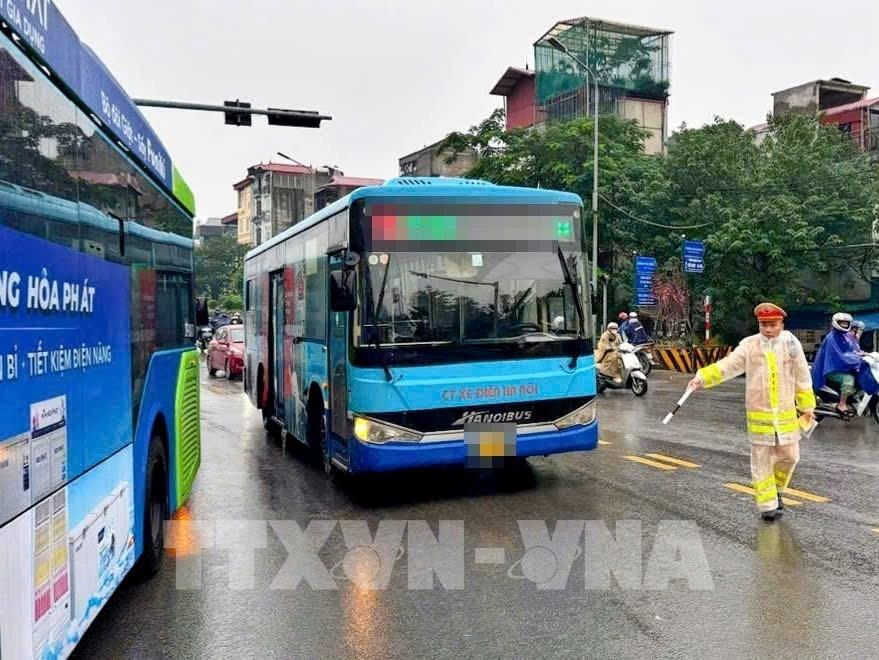 Nhiều xe buýt đi sai luồng tuyến tại khu vực phía Bắc Cầu Chương Dương bị lực lượng chức năng phát hiện và xử lý sáng 18/11/2025. Ảnh: TTXVN