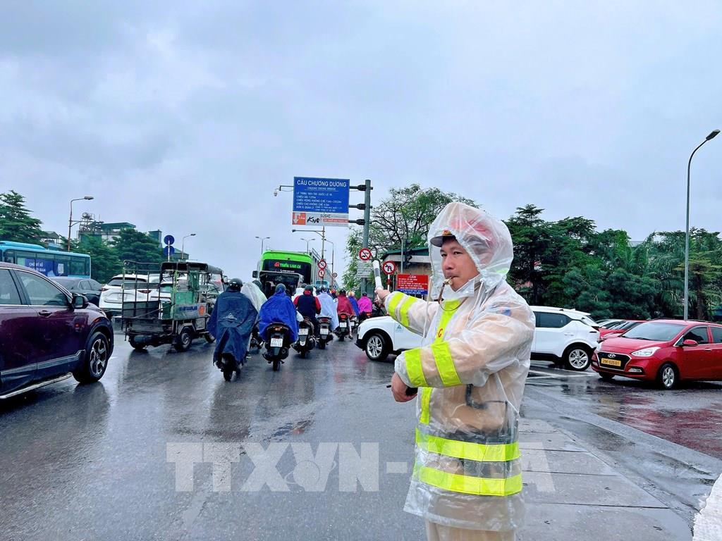 Cảnh sát giao thông Hà Nội phân luồng, điều tiết phương tiện tại khu vực phía Bắc Cầu Chương Dương sáng 18/11/2025. Ảnh: TTXVN phát