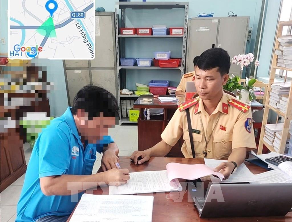 Đội Cảnh sát giao thông đường bộ số 2 lập biên bản vi phạm hành chính đối với lái xe N.T.P. Ảnh: TTXVN phát