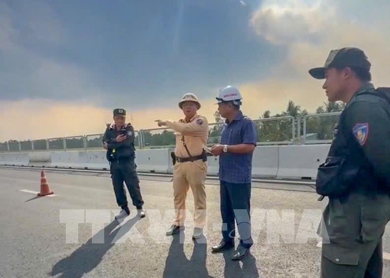 Đội Cảnh sát giao thông Đường bộ cao tốc số 7 làm việc với đơn vị thi công của Tổng Công ty Xây dựng T.S. Ảnh: TTXVN phát