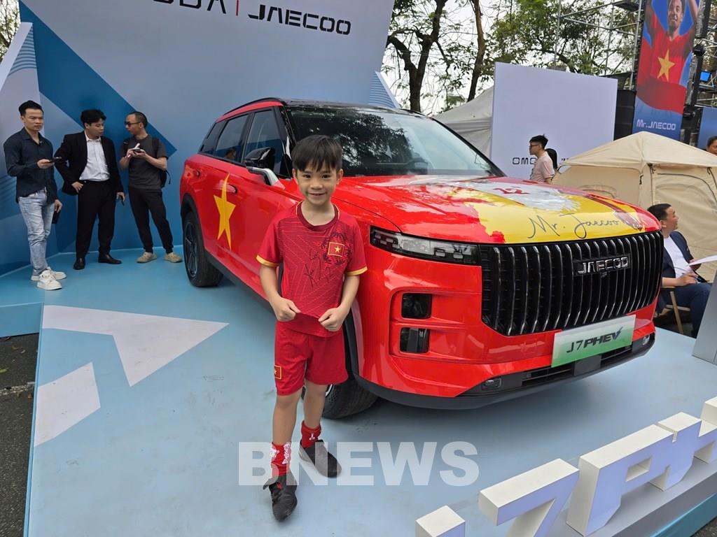 Fan nhí khoe áo có chữ ký của cầu thủ Xuân Son tạo dáng bên chiếc Jaecoo J7. Ảnh: Văn Xuyên/BNEWS/TTXVN