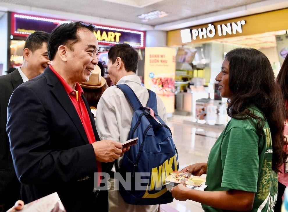 Lãnh đạo Vietjet tặng phong bao lì xì cho hành khách xuất hành đầu Xuân năm mới. Ảnh: Lê Minh/Bnews/vnanet.vn